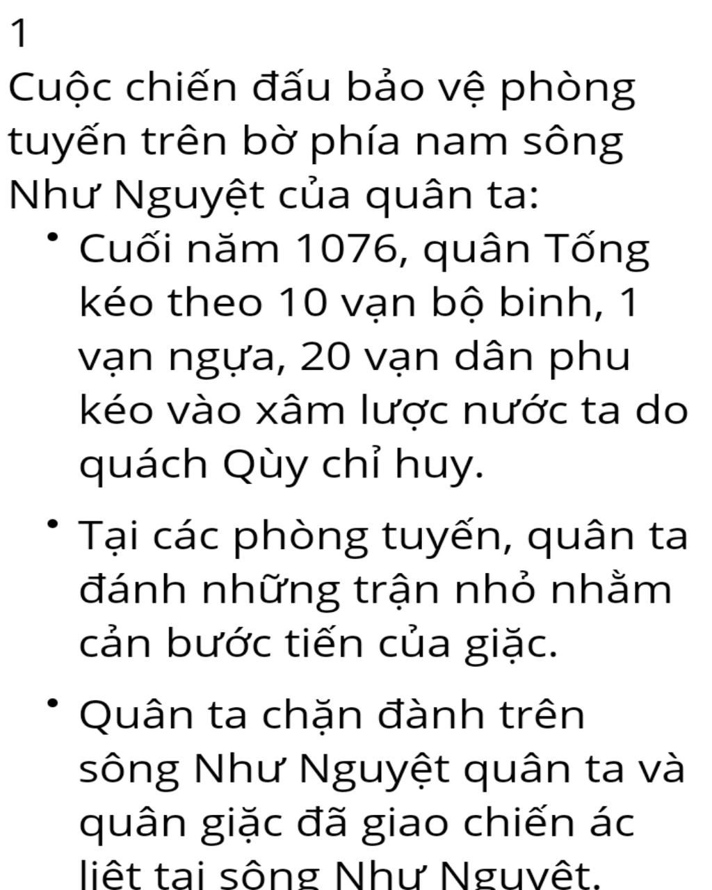 1.Dựa vào lược đồ, em hãy kể lại cuộc chiến đấu bảo vệ phòng tuyến sông Như Nguyệt trên bờ phía Nam sông Như Nguyệt của quân ta. 2.Nêu kết quả của cuộc kháng chiến chống quân Tống xâm lược lần thứ hai.