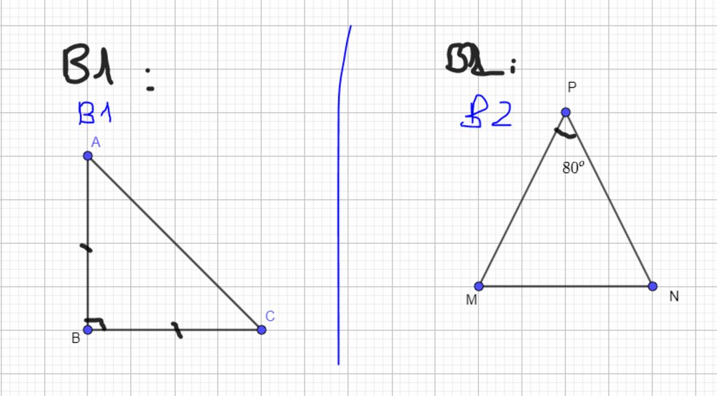 B2:ΔMNP cân tại P. Biết góc P = 80°.Tính góc M
