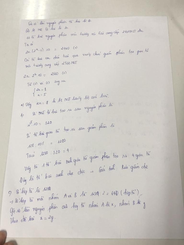 Bài tập 4: 10 tế bào sinh dục của một cơ thể nguyên phân liên tiếp một số đợt đòi hỏi môi trường nội bào cung cấp nguyên liệu để tạo ra 2480 NST đơn mới tương đương. Các tế bào con đều trải qua vùng sinh trưởng bước vào vùng chín, giảm phân tạo nên các giao tử, môi trường nội bào đã cung cấp thêm nguyên liệu tạo nên 2560 NST đơn. Hiệu suất thụ tinh của giao tử 10% tạo nên 128 hợp tử lưỡng bội bình thường. a. Xác định bộ NST lưỡng bội của loài? b. Xác định giới tính của cơ thể tạo nên các giao tử trên? c. Các hợp tử được chia thành hai nhóm A và B có số lượng bằng nhau. Mỗi hợp tử trong nhóm A có số đợt nguyên phân gấp 2 lần số đợt nguyên phân trong nhóm B. Các hợp tử trong mỗi nhóm có số đợt nguyên phân bằng nhau. Tổng số NST đơn có trong toàn bộ các tế bào con sinh ra từ 2 nhóm bằng 10240 NST đơn lúc chưa nhân đôi. Tìm số đợt nguyên phân của mỗi hợp tử trong mỗi nhóm tế bào?