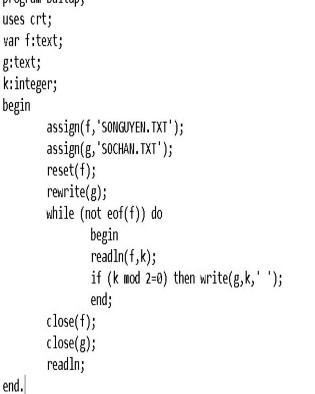 Cho một tệp văn bản, tên tệp là SONGUYEN.TXT tệp này chứa các số nguyên liên tiếp, các số cách nhau bởi dấu cách và không kết thúc bằng kí tự xuống dòng. Viết chương trình đọc từ tệp SONGUYEN.TXT và đưa ra màn hình các số chẵn