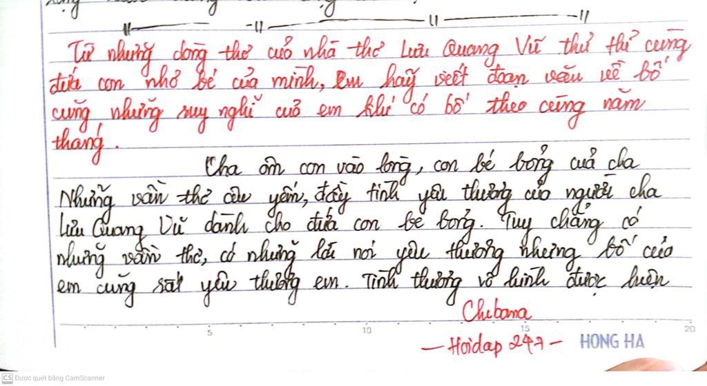 Conlặngnhìntíttắpbãingôxa/ Bênkiasônglàgìhảcha?/Bênkiasôngcó đường đất đỏ / Có những ruộng mía trổ cờ trắng xóa / Những vườn đầy cỏ ngọt những đồng hoa / Có bướm vàng không cha / Có, có rất nhiều bươm bướm / Con thì thầm trong hơi thở mạnh / Sông rộng thế làm sao sang được / Cha ôm con vào lòng, con bé bỏng của cha / Bên kia sông có nhiều bướm nhiều hoa / Rồi cha con ta sẽ tìm được con đò / Đi sang bên ấy. Đó là những câu thơ mà nhà thơ Lưu Quang Vũ thủ thỉ cùng đứa con bé bỏng của mình. Bằng cảm xúc từ bài đọc và đoạn thơ trên, em hãy viết đoạn văn về bố của mình cùng những suy nghĩ trong tương lai của em khi có bố theo cùng năm tháng.