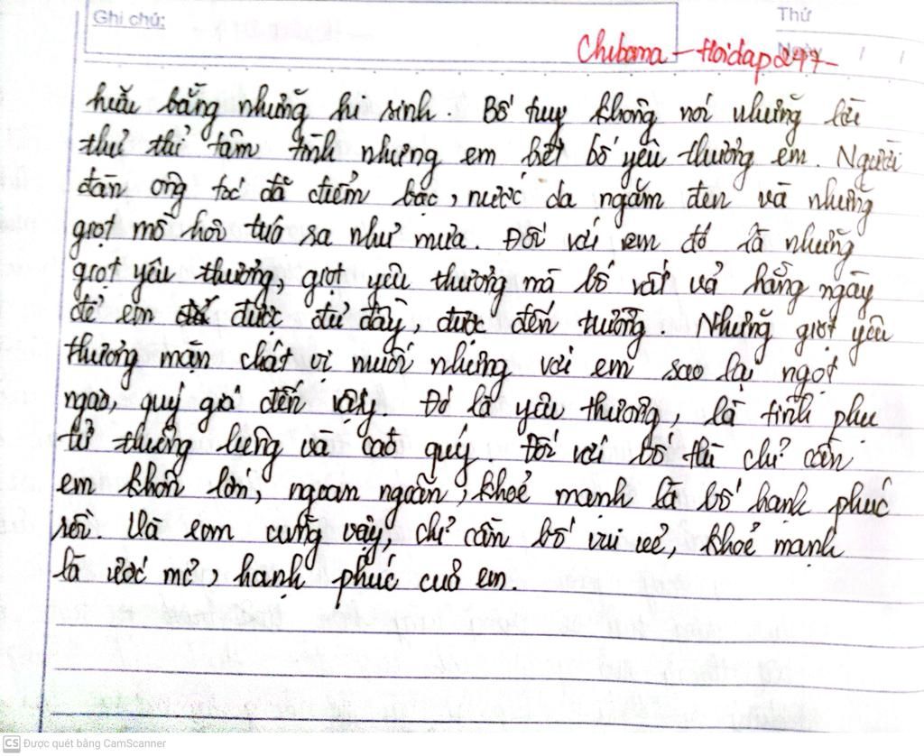 Tôi biết ở cơ quan bố làm việc rất vất vả. Là thợ giỏi nên không những chỉ làm việc của mình mà bố còn luôn giúp đỡ đồng nghiệp nên ai cũng quý mến. Tính bố hiền, ít nói. Bố tôi luôn dạy tôi phải sống trung thực, thật thà.