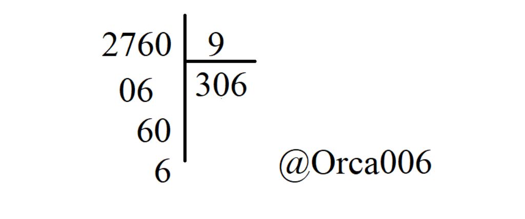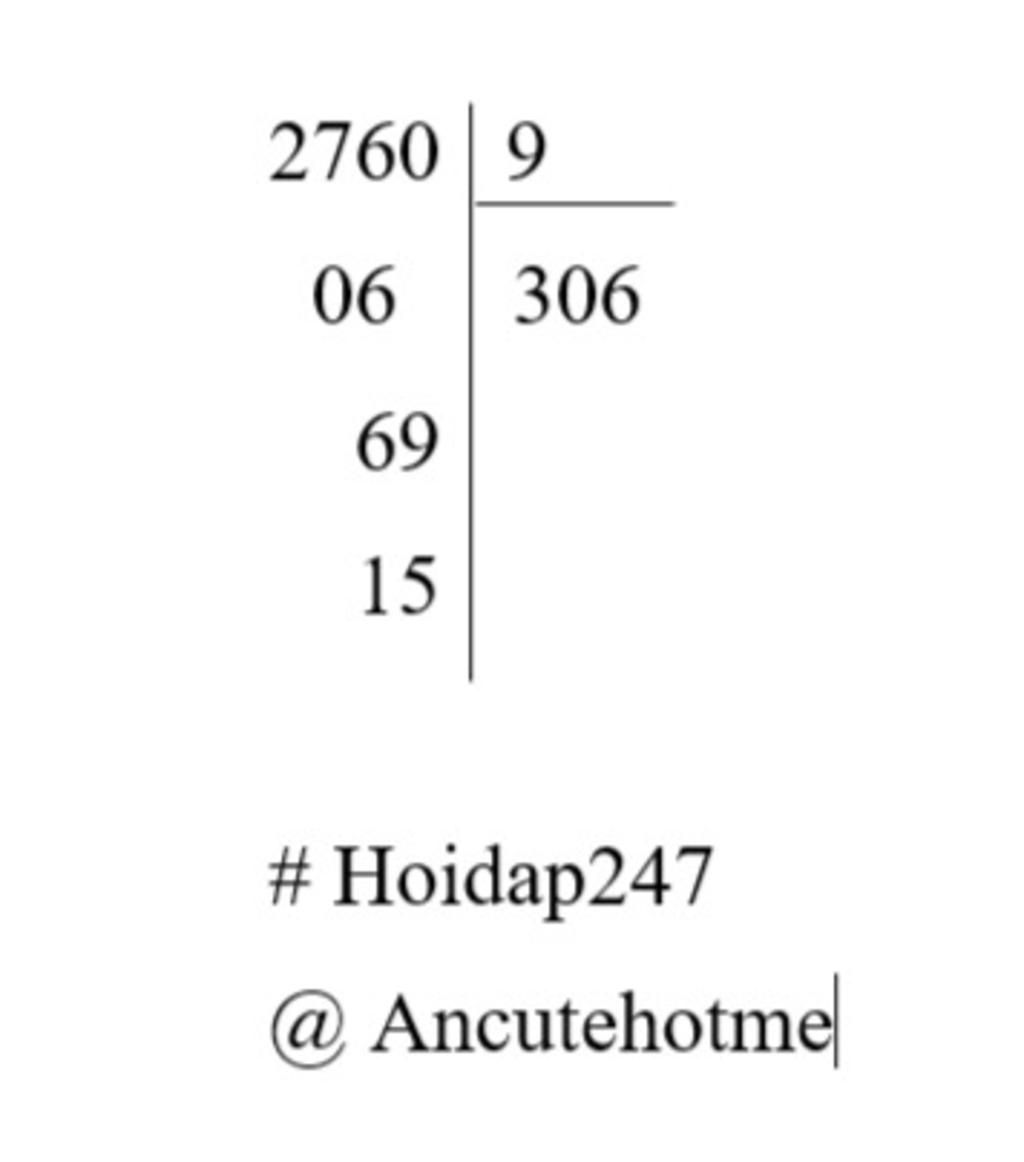 Vậy $\text{2760 : 9 = 306 ( dư 15 )}$