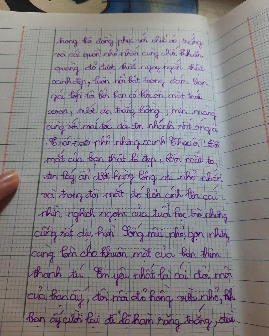 Khánh Linh là bạn ngồi cùng bàn và cũng là người bạn thân nhất của tôi từ nhỏ đến bây giờ. Bạn ấy có nước da trắng hồng và dáng người nhỏ nhắn hơn so với các bạn cùng lớp. Các bạn trong lớp thường trêu đùa rằng nước da bạn ấy trắng như trứng gà bóc. Khuôn mặt Khánh Linh bầu bĩnh trông rất đáng yêu. Mái tóc bạn cắt ngắn đến ngang vai và được buộc thành hai bím tóc với cái nơ màu tím trông vô cùng xinh xắn. Đôi mắt đen láy của Khánh Linh luôn thể hiện sự thông minh, nhanh nhạy của một cô bé 10 tuổi. Không chỉ vậy, Khánh Linh còn có đôi môi hồng hồng luôn nở nụ cười thật tươi với tất cả mọi người.