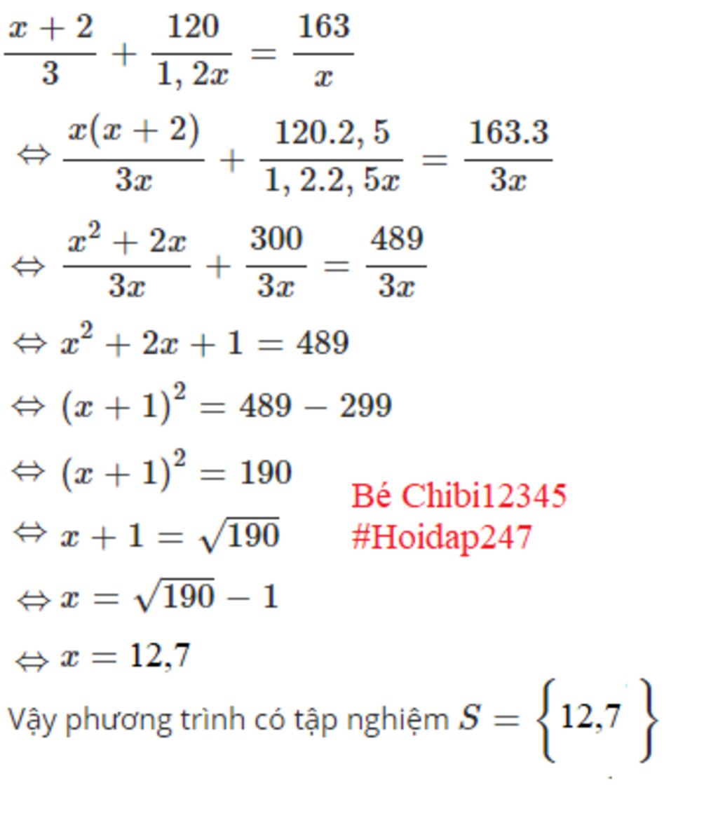 `{x+2}/3+{120}/{1,2x}={163}/x`