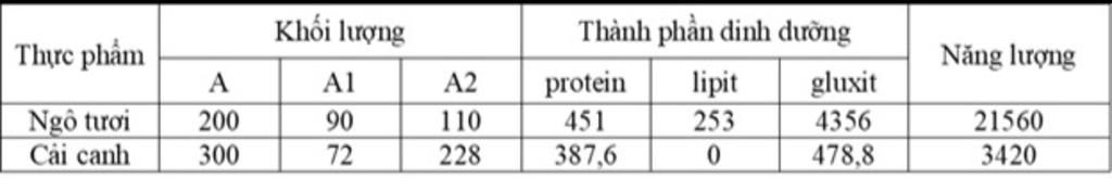 Hãy xác định lượng thải bỏ A1, lượng thực phẩm A2 các thực phẩm dinh dưỡng như protein, lipit, gluxit, năng lượng cung cấp khi sử dụng 1 số thực phẩm