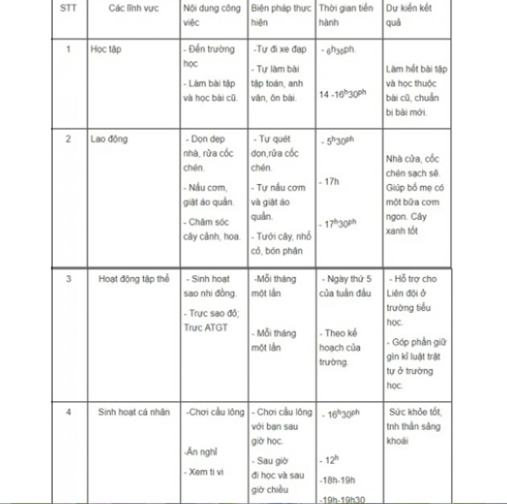 - 17 giờ - 19 giờ 30 phút: chạy bộ, giúp mẹ nấu ăn, ăn tối…