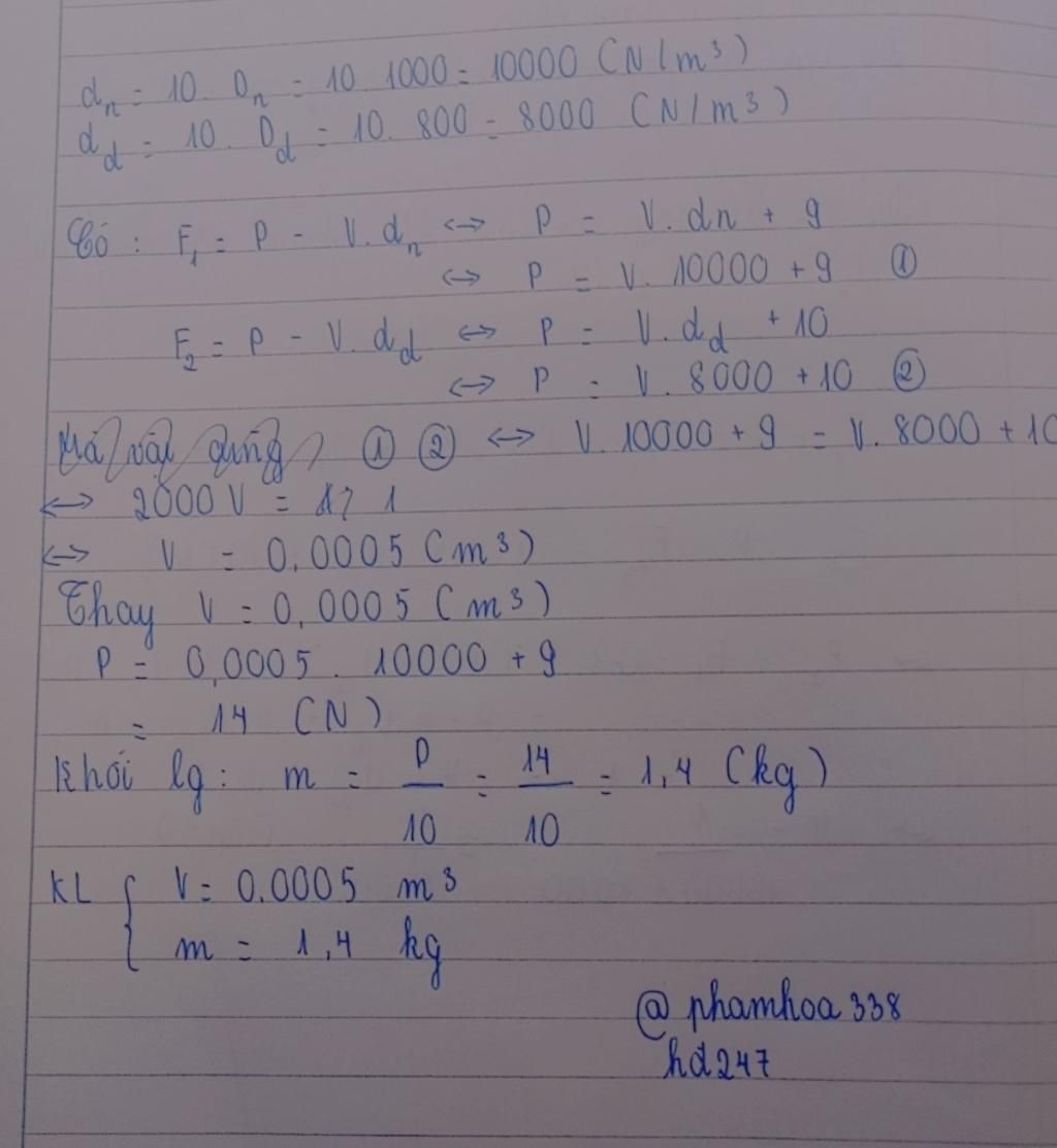 Một vật treo vào lực kế, nhúng chìm vật trong nước thì lực kế chỉ 9N, nhúng chìm trong dầu thì chỉ 10N. Tìm khối lượng và thể tích của vật biết Dn =1000kg/m3, D dầu=8000kg/m3