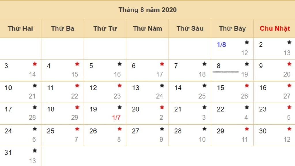 Ta thấy ngày 8 tháng 8 là thứ 7 của năm 2020. Vậy chỉ cần xem lịch 2020 chúng ta sẽ biết đáp án.