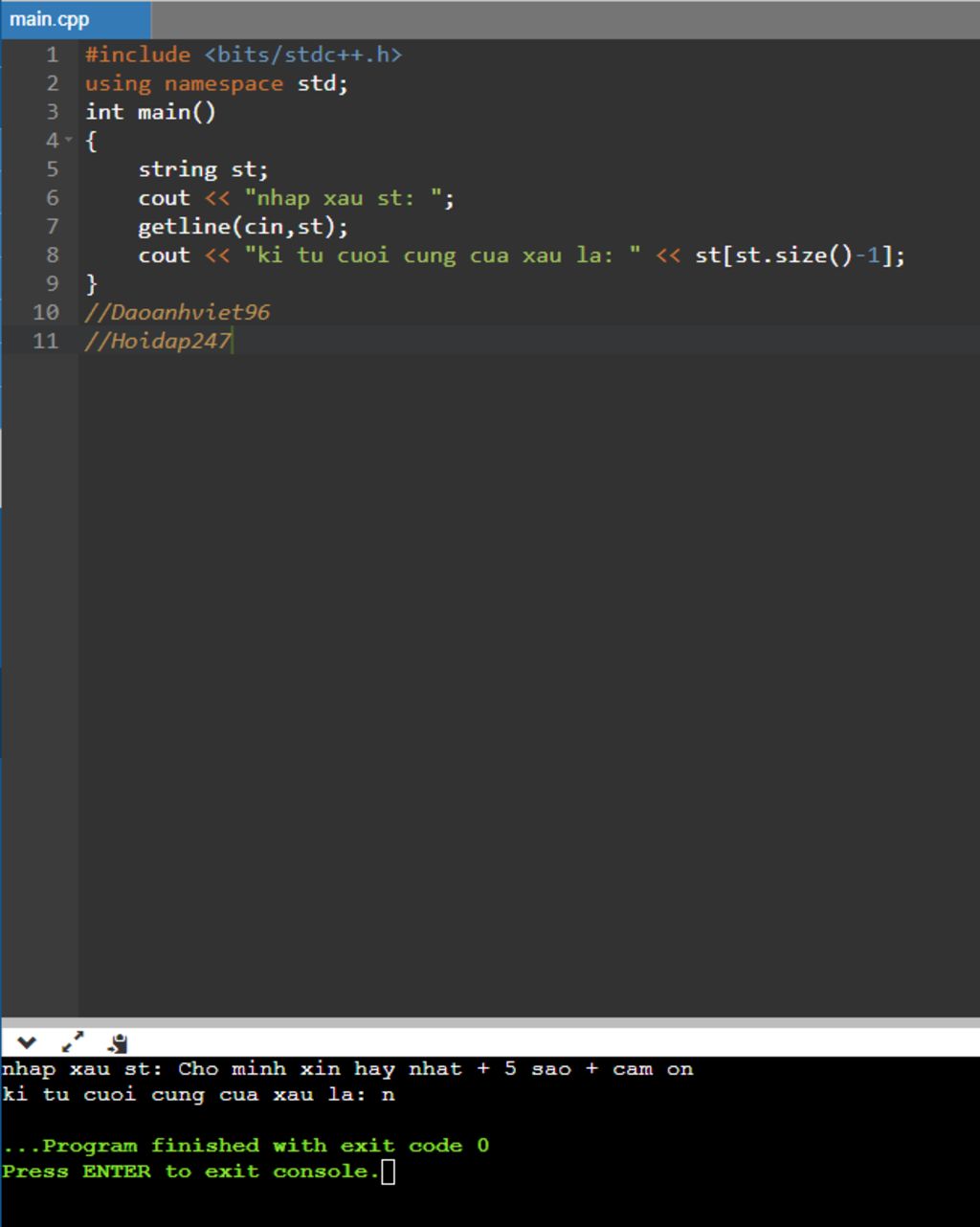 cout << "ki tu cuoi cung cua xau la: " << st[st.size()-1];