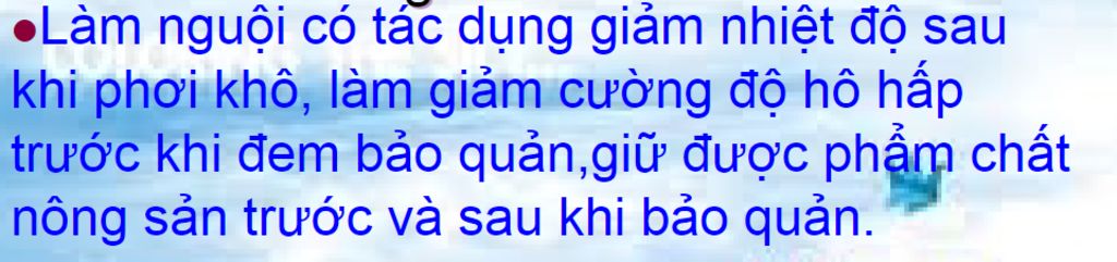 Trong quá trình bảo quản hạt giống, sau khi làm khô thì phải làm ngơi sản phẩm trứoc khi đưa vào bảo quản vì mới làm khô xong thì nhiệt độ của hạt giống rất cao nếu đưa vào bảo quản thì hạt giống sẽ bị ẩm gây nấm mốc ko bảo quản đc hạt giống được lâu