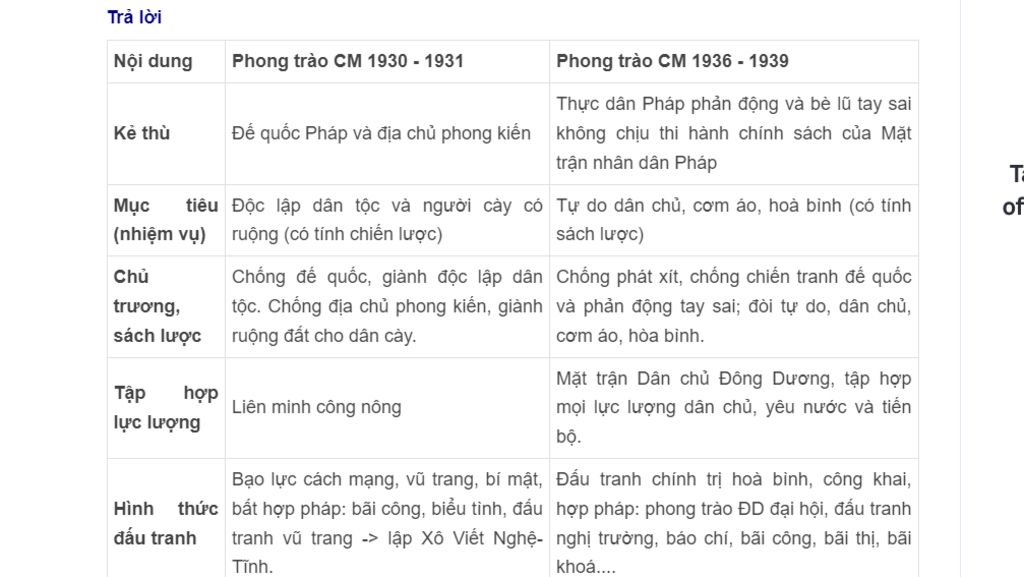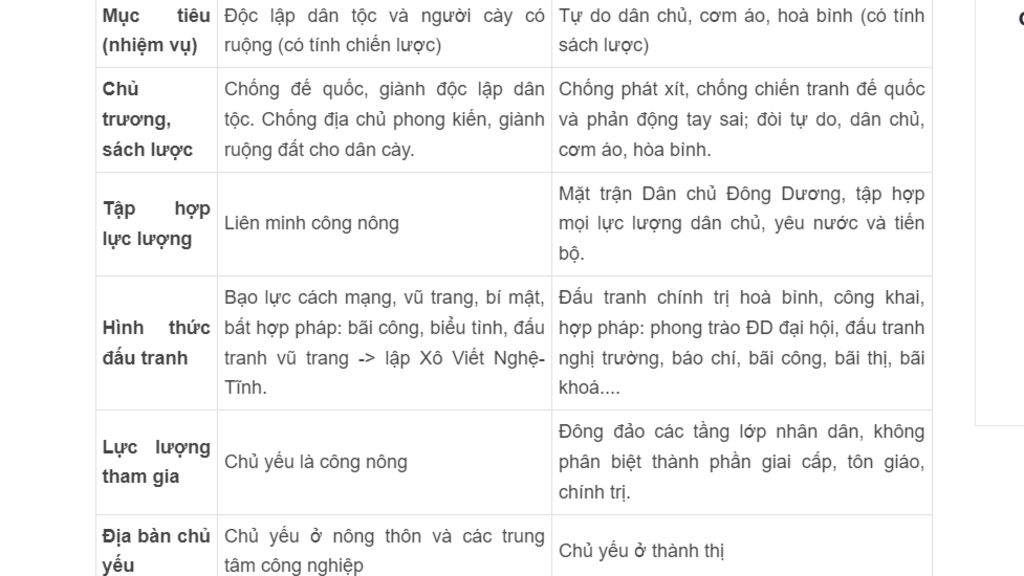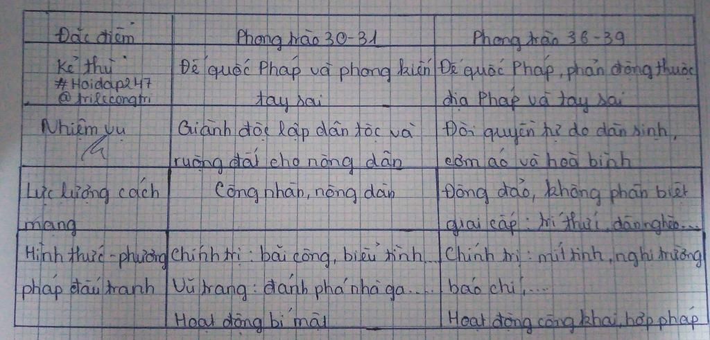 So sánh đặc điểm (kẻ thù, nhiệm vụ, lực lượng cách mạng, hình thức - phương pháp đấu tranh) của phong trào cách mạng 1930 - 1931 và phong trào dân chủ 1936 - 1939?