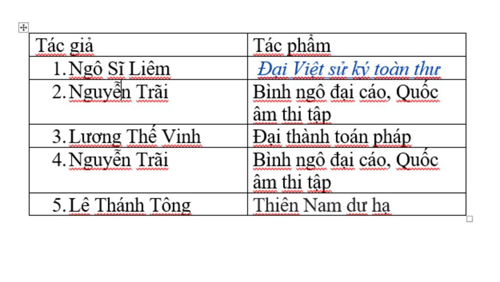 Tác giả ; Tác Phẩm 1. Ngô Sĩ Liêm 2. Nguyễn Trãi 3. Lương Thế Vinh 4. Nguyễn Trải 5. Lê Thánh Tông