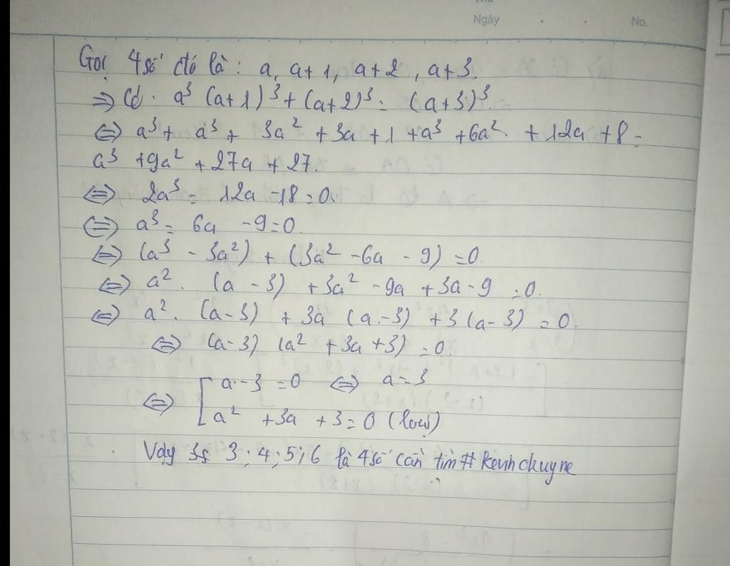 TÌM 4 số tự nhiên tiếp sao cho tổng lập phương của mỗi 3 số đầu bằng lập phương của số thứ 4