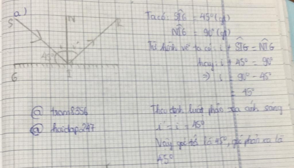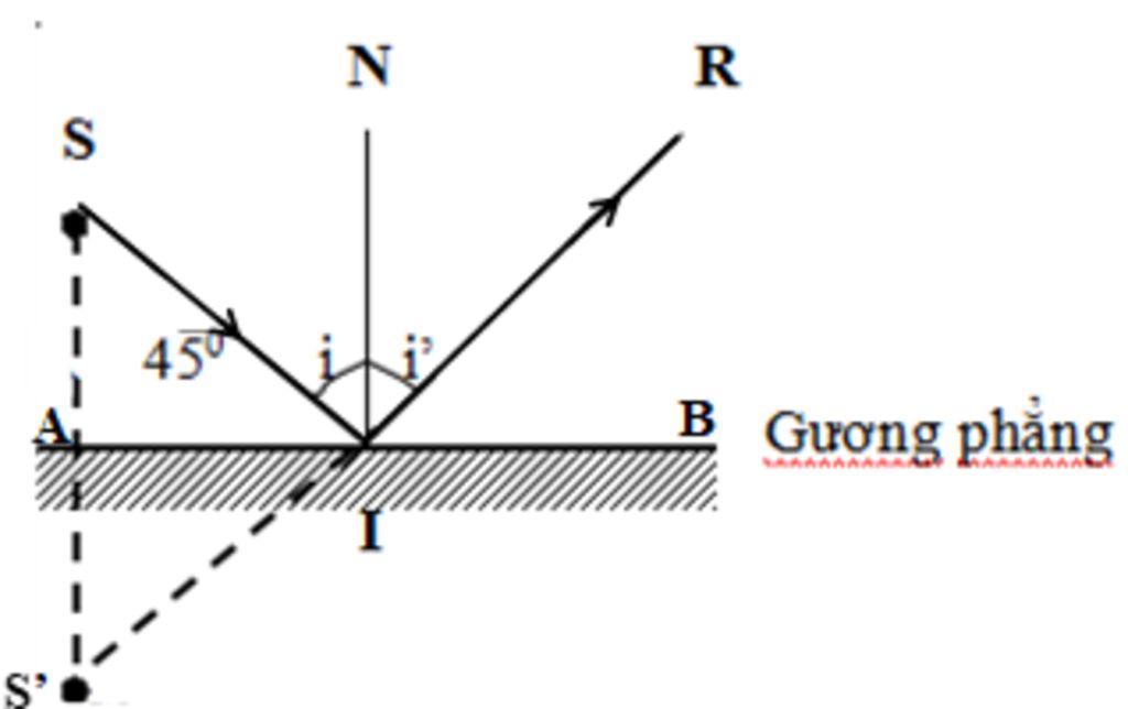 trên hình vẽ có 1 tia Sl chiến lên 1 gương phẳng. góc tạo bởi tia SL với mặt gương bằng 45°
