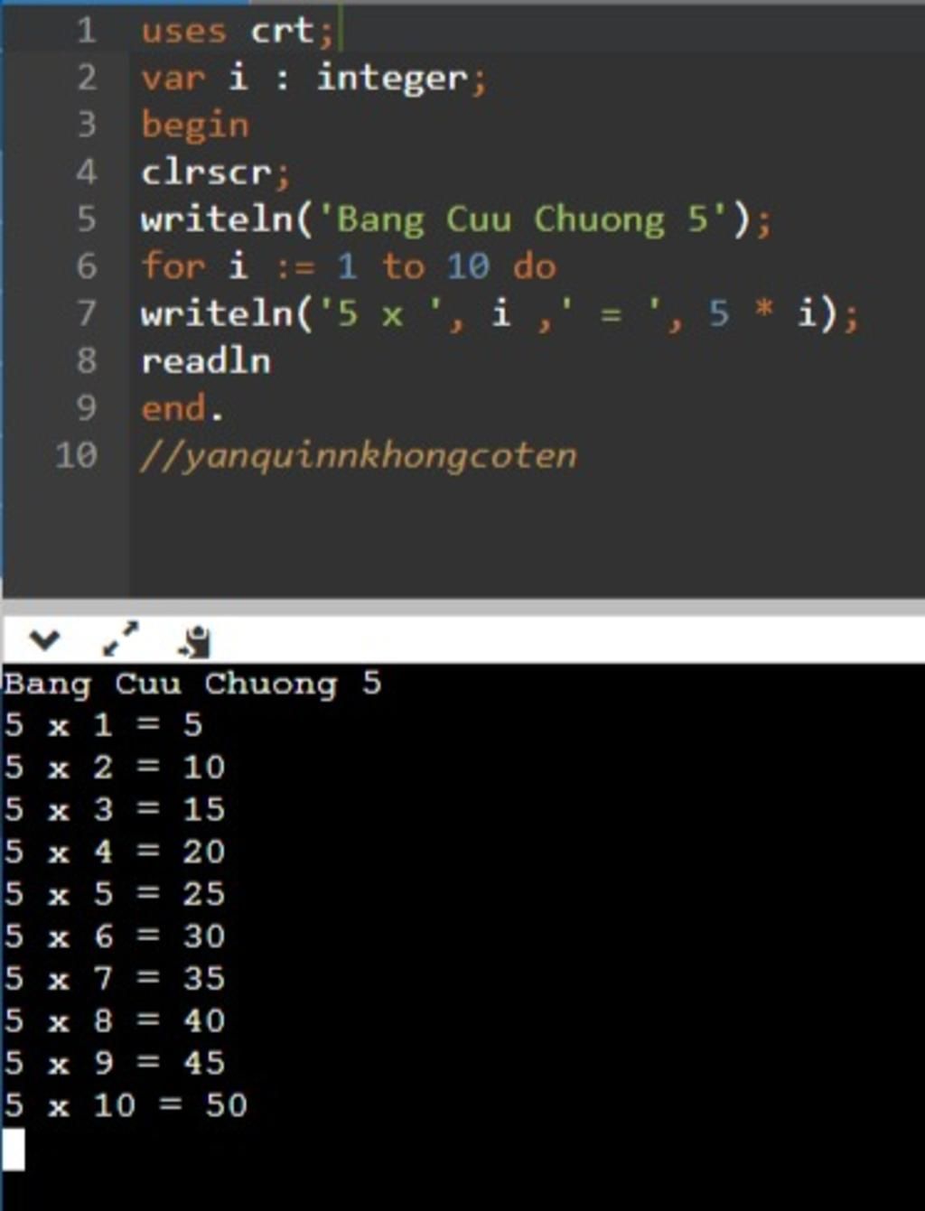 Viết chương trình bằng ngôn ngữ lập trình pascal để in ra màn hình bảng cửu chương 5 giúp em với ạ