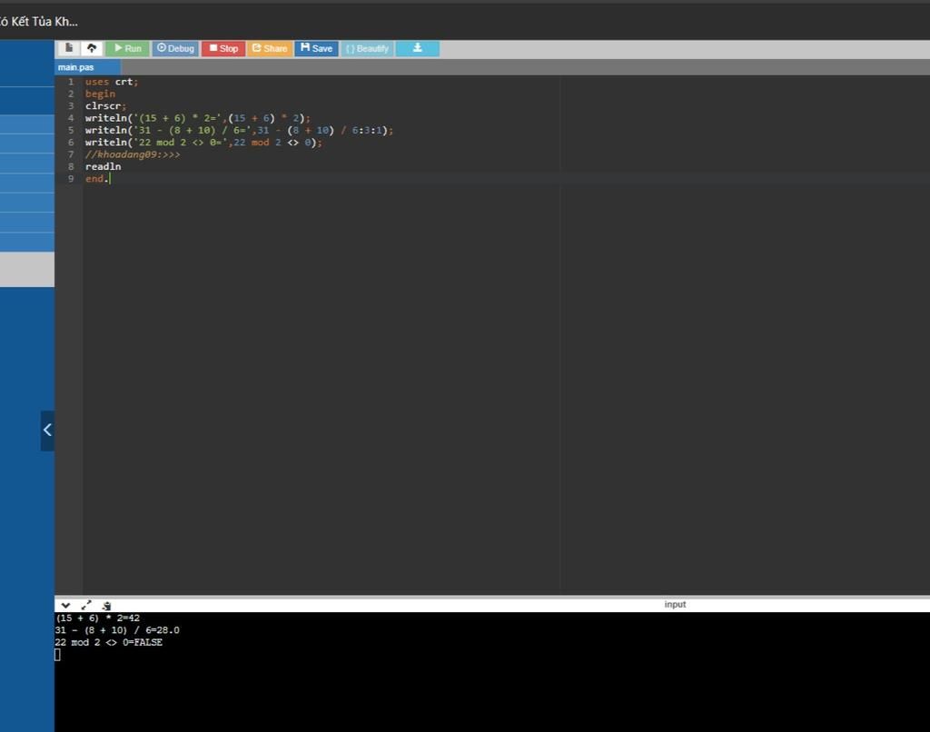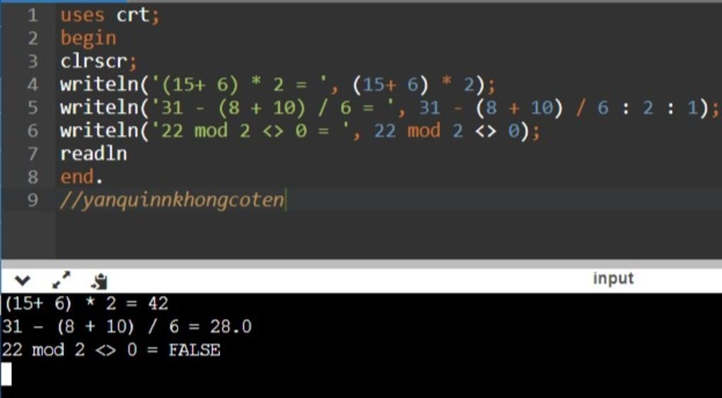 Viết chương trình cho biết kết quả của biểu thức sau: a) (15 + 6) * 2 b) 31 - (8 + 10) / 6 (làm tròn 1 số thập phân) c) 22 mod 2 <> 0