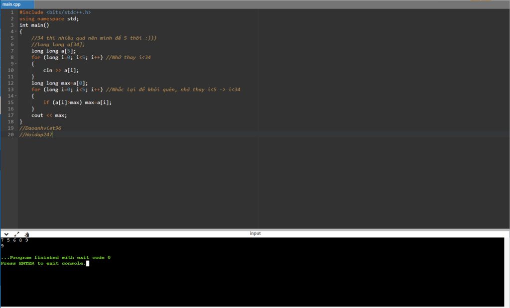 for (long i=0; i<5; i++) //Nhắc lại để khỏi quên, nhớ thay i<5 -> i<34