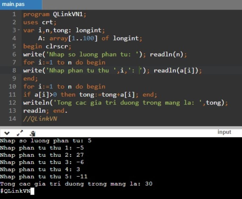 Viết chương trình nhập vào một mảng gôm n số nguyên (<=100) rồi thực hiện công việc sau: tính tổng các phần tử giá trị dương của chúng