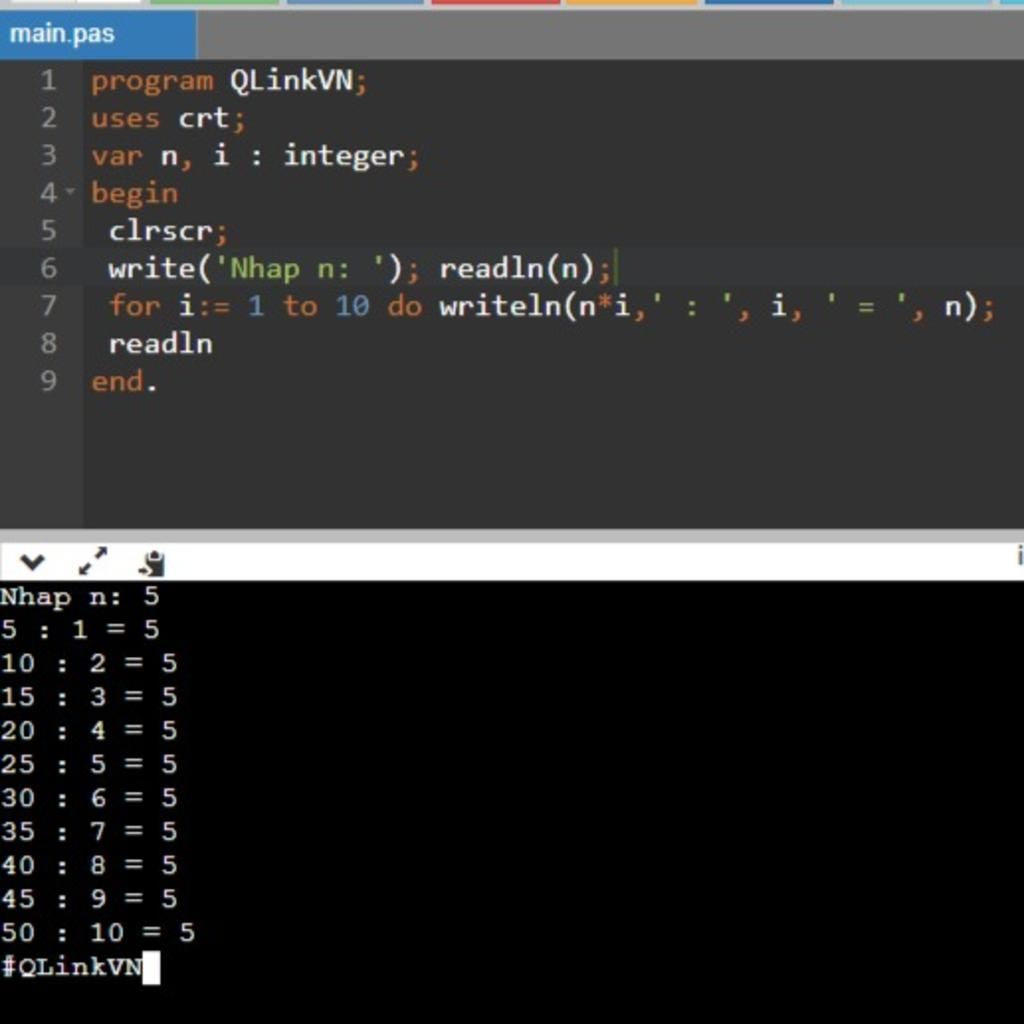 viết chương trình thực hiện yêu cầu: nhập số nguyên n từ bàn phím. Làm bảng chia n từ 1 đến 10 ạ (viết = pascal ạ)