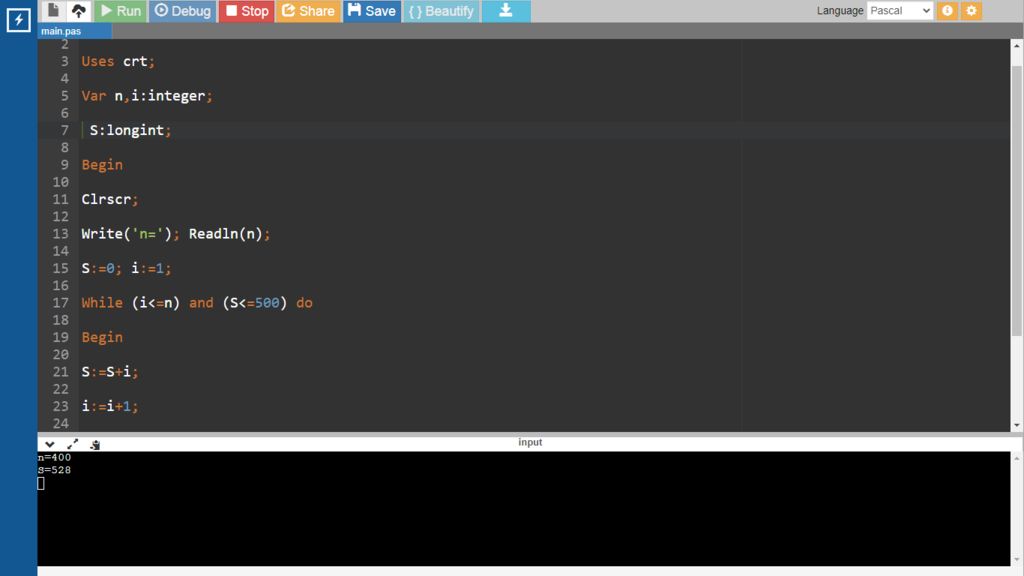 While (i<=n) and (S<=500) do